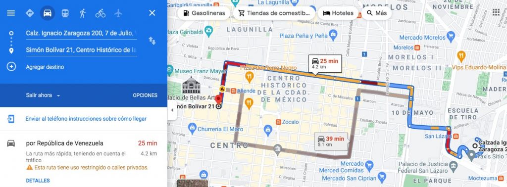 Puedes tomar un TAXI/UBER hacia la calle de Bolívar #21, son aproximadamente 30 minutos (cuando hay tráfico moderado).